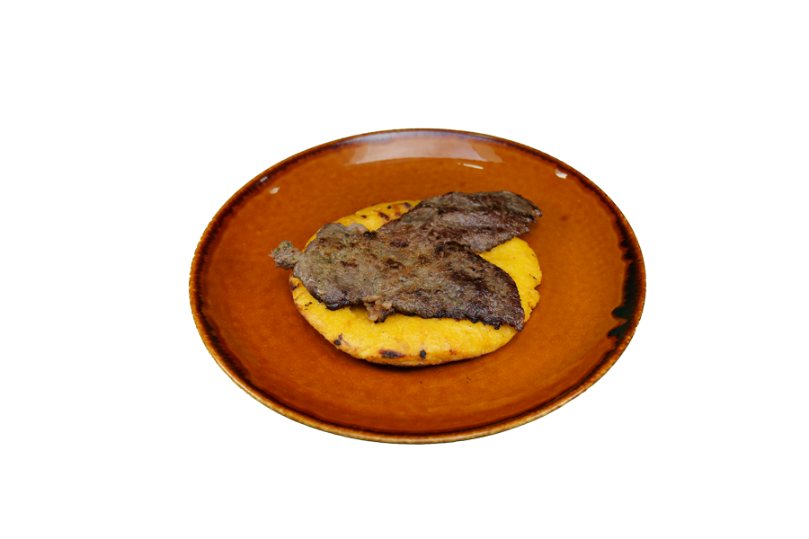 Deliciosa arepa de la casa azada al carbón acompañada con carne de res la plancha