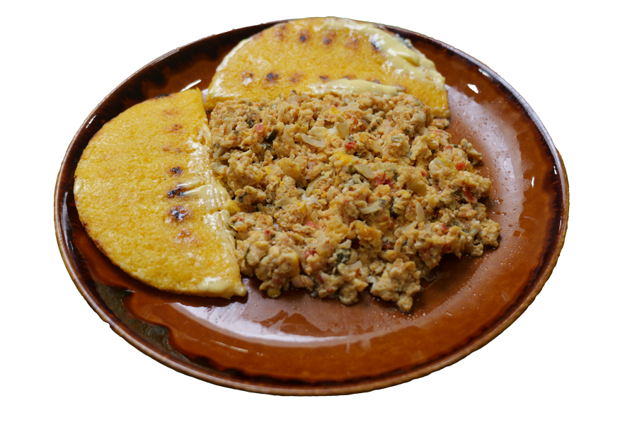 Deliciosa arepa de la casa azada al carbón acompañada de huevos revueltos tomate y cebollas