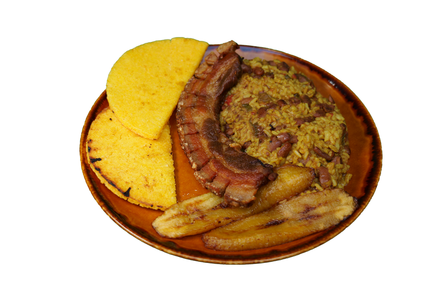 Nuestro tradicional Calentado de frijoles con arroz, arepa, tajadas de plátano maduro y Chicharrón frito.