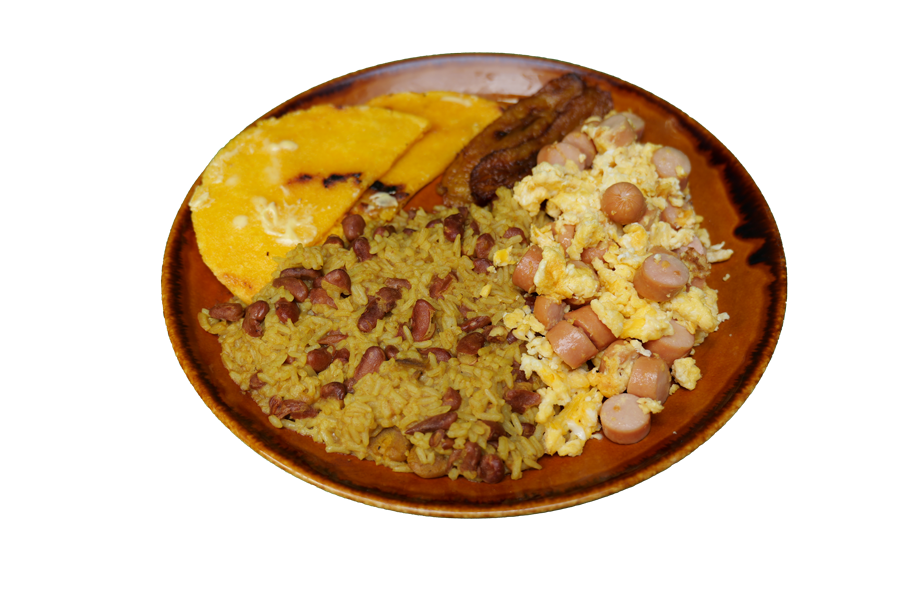 Nuestro tradicional Calentado de frijoles con arroz, arepa, tajadas de plátano maduro y huevos fritos con salchicha.