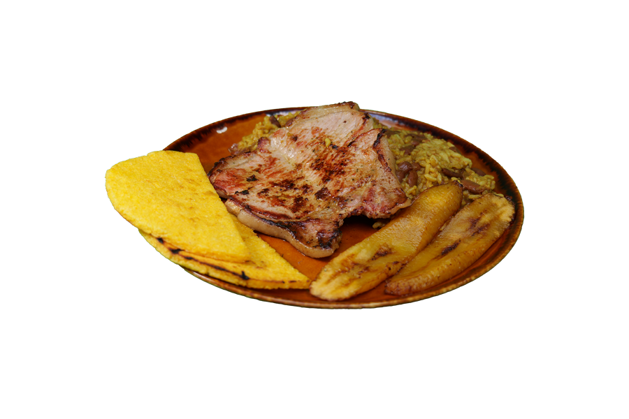Nuestro tradicional Calentado de frijoles con arroz, arepa, tajadas de plátano maduro y carne de cerdo a la plancha.